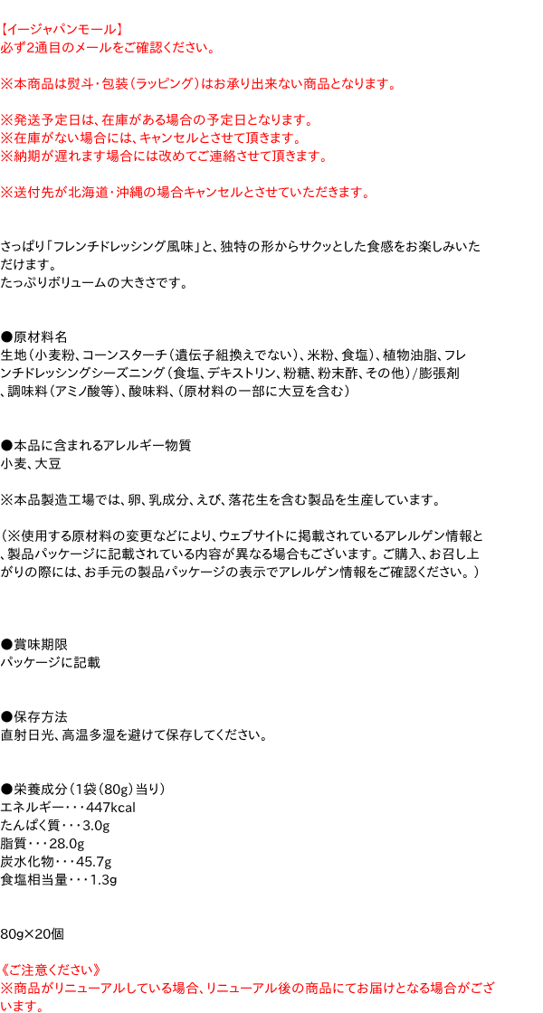 ●原材料名 生地(小麦粉、コーンスターチ(遺伝子組換えでない)、米粉、食塩)、植物油脂、フレンチドレッシングシーズニング(食塩、デキストリン、粉糖、粉末酢、その他)/膨張剤、調味料(アミノ酸等)、酸味料、(原材料の一部に大豆を含む) ●本品に含まれるアレルギー物質 小麦、大豆 ※本品製造工場では、卵、乳成分、えび、落花生を含む製品を生産しています。